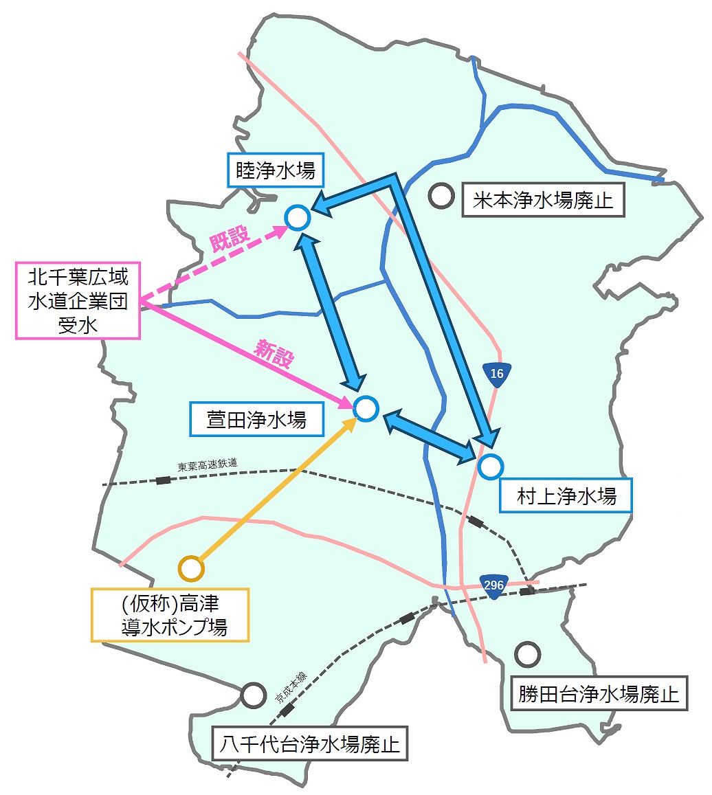 再構築では、55年度までに、八千代台浄水場、高津浄水場、米本浄水場、勝田台浄水場を廃止し、睦浄水場、萱田浄水場、村上浄水場への統廃合を進める。