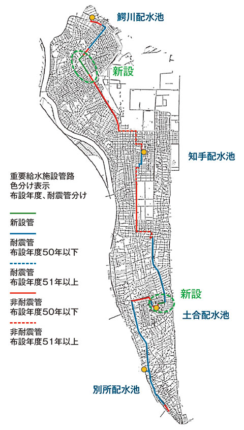 最優先に管路更新を進める基幹管路には、送水管と配水本管(φ200㎜以上)の中から4配水場(鰐川・知手・土合・別所)を連絡するもので、海岸沿いを除くルートを選定。第Ⅰ期(26~35年度)では耐震化率約90%を目指す。