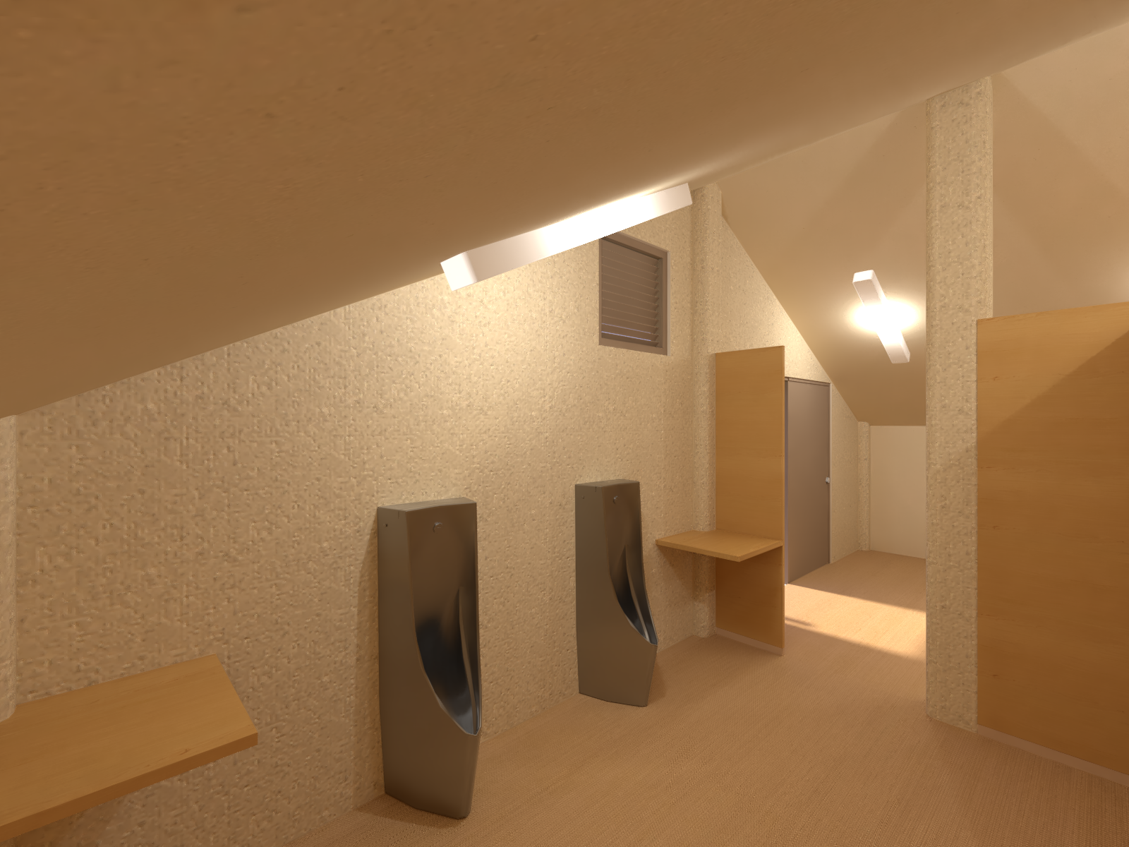 トイレ内の床は杉板を使用し、40・4㎡で施工。便器は小便器2基と洋式便器4基を設置する。洋式便器に暖房便座とウォシュレット機能は設けない。