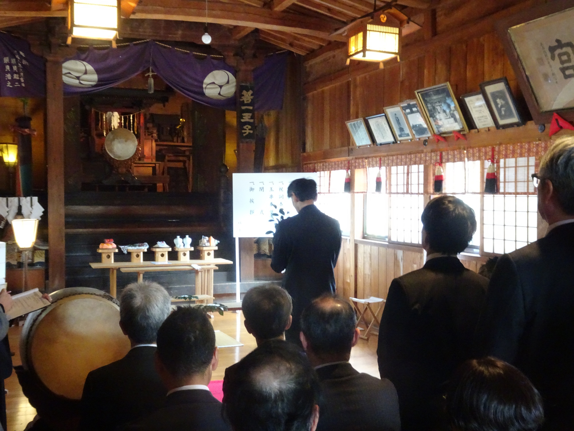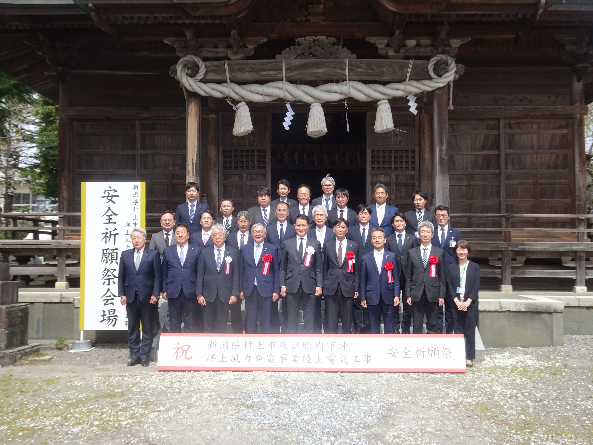 村上胎内洋上風力発電(前田益尚社長兼CEO)は9日、発電事業における陸上電気工事安全祈願祭を胎内市東本町の熊野若宮神社で執り行った。同社7人、かんでんエンジニアリング・栗原工業・大林道路JV9人、新潟県5人、村上市5人、胎内市4人、国土交通省2人の計32人が列席。各代表者が玉串奉奠を行い工事の安全を祈願するとともに、快晴の良き日に記念撮影で笑顔を見せた。