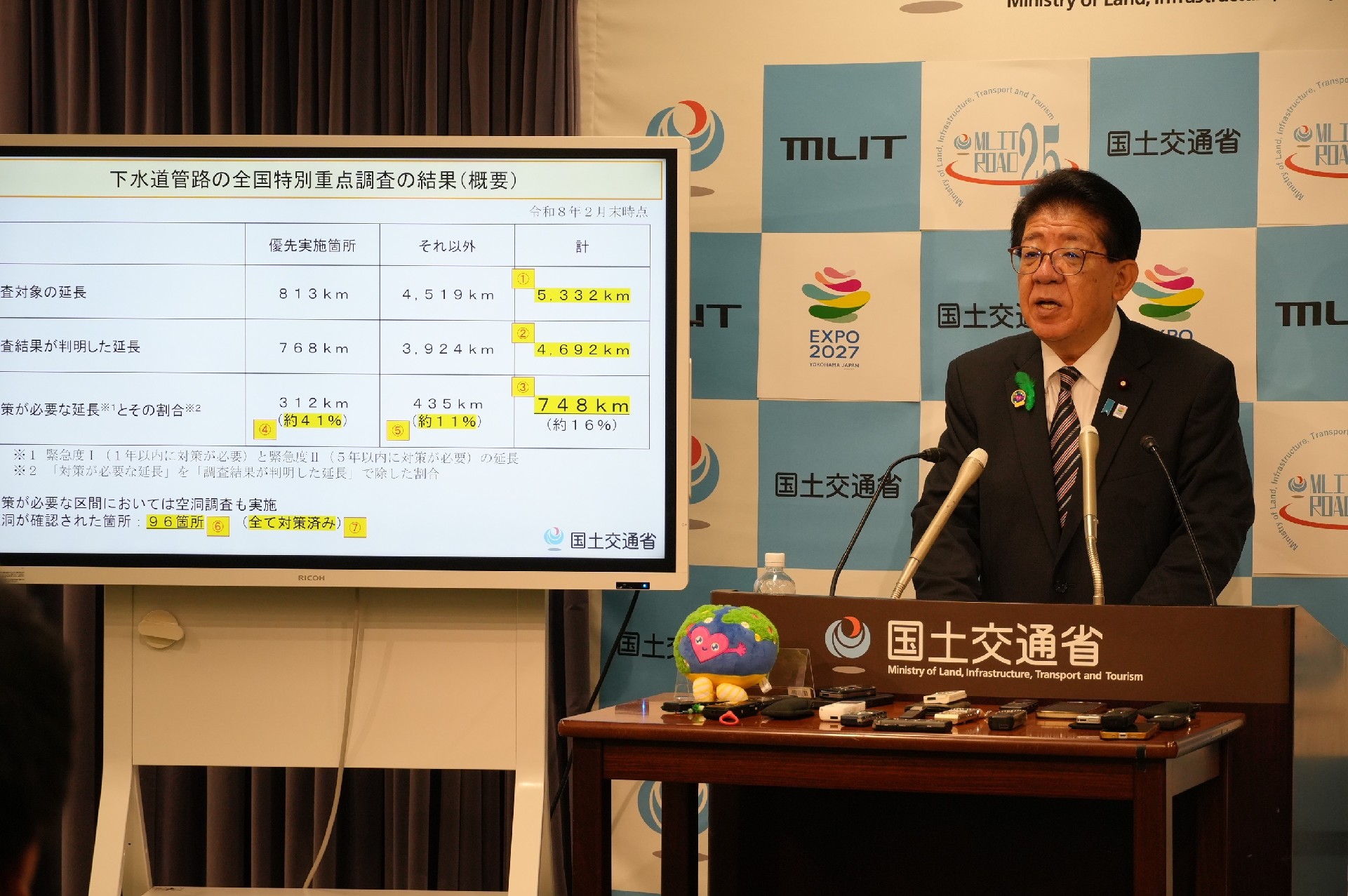 金子恭之国土交通相は21日の会見で「強い決意のもと、地方公共団体と連携して、強靱で持続可能な下水道の構築に向けて一層の取り組みの充実と強化を図っていく」とコメントした。