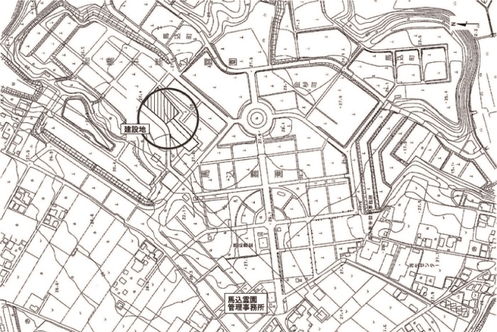 建設地は、馬込霊園管理事務所の北東側。現況は、さら地。合葬墓の区画面積は約1850㎡。